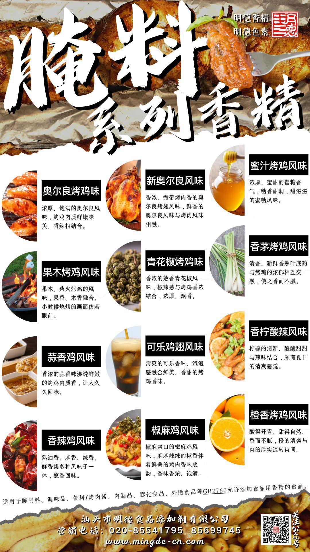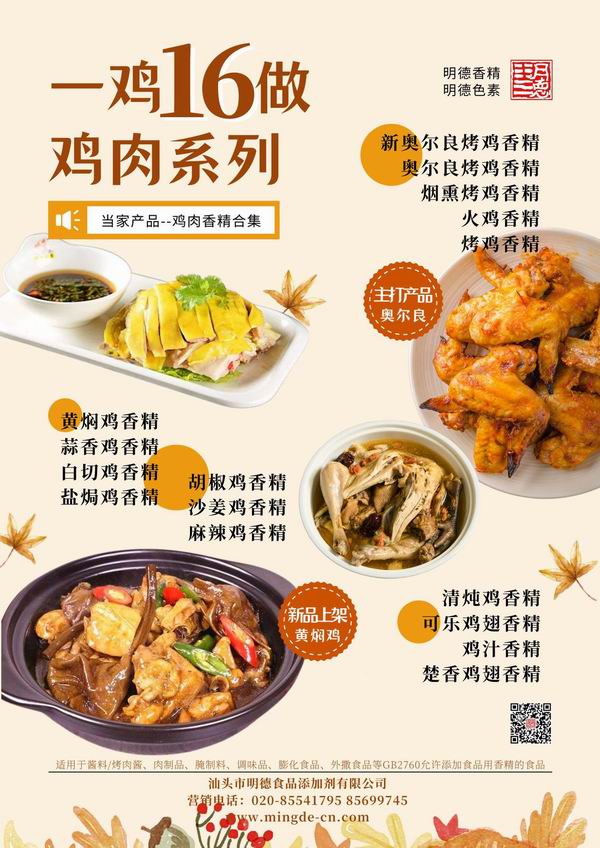 在雞肉香精領域我們潛心專研,結合市場潮流,消費者喜好,汕頭市明德食品添加劑有限公司現(xiàn)有以下16種雞肉相關風味的香精,供您選擇。并持續(xù)努力研發(fā)更多符合市場需求的風味。