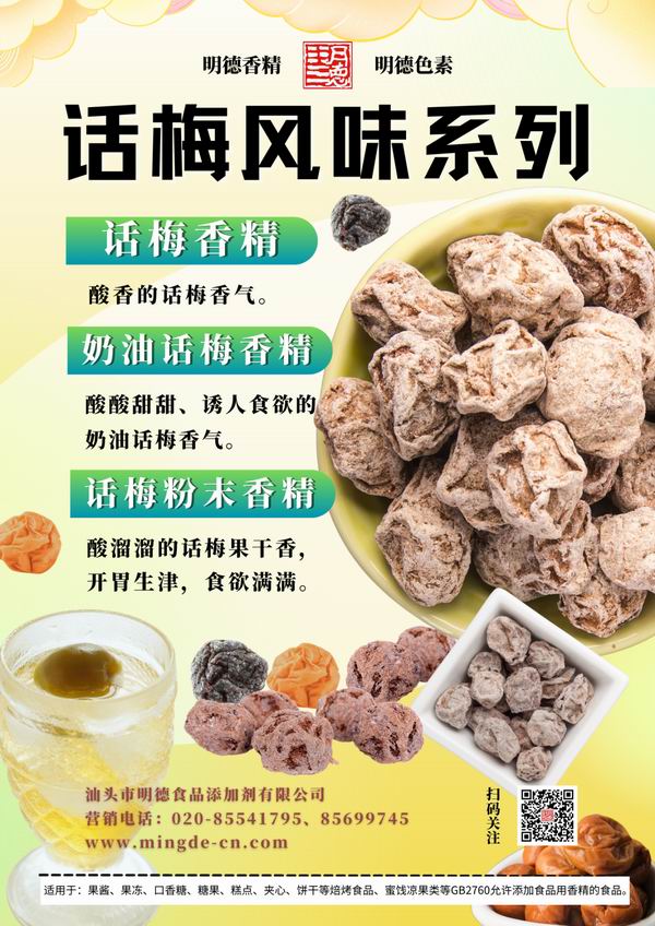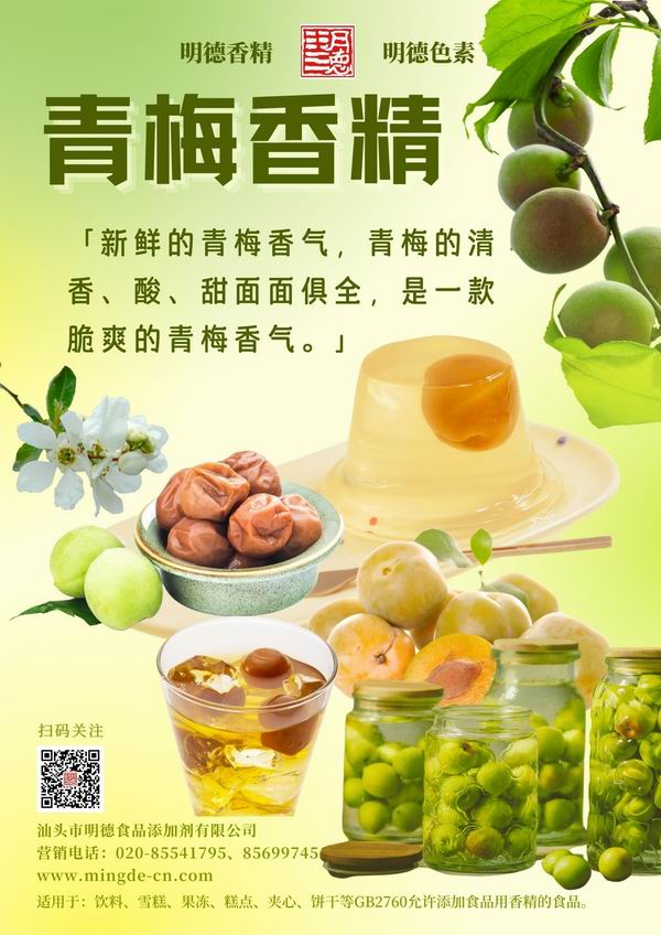 在梅子風(fēng)味香精領(lǐng)域我們數(shù)十年潛心專研,迎合市場(chǎng)需求,滿足消費(fèi)者喜好,汕頭市明德食品添加劑有限公司,推出了多種款梅子風(fēng)味香精,如:青梅風(fēng)味、酸梅風(fēng)味、話梅風(fēng)味、酸梅湯風(fēng)味等。