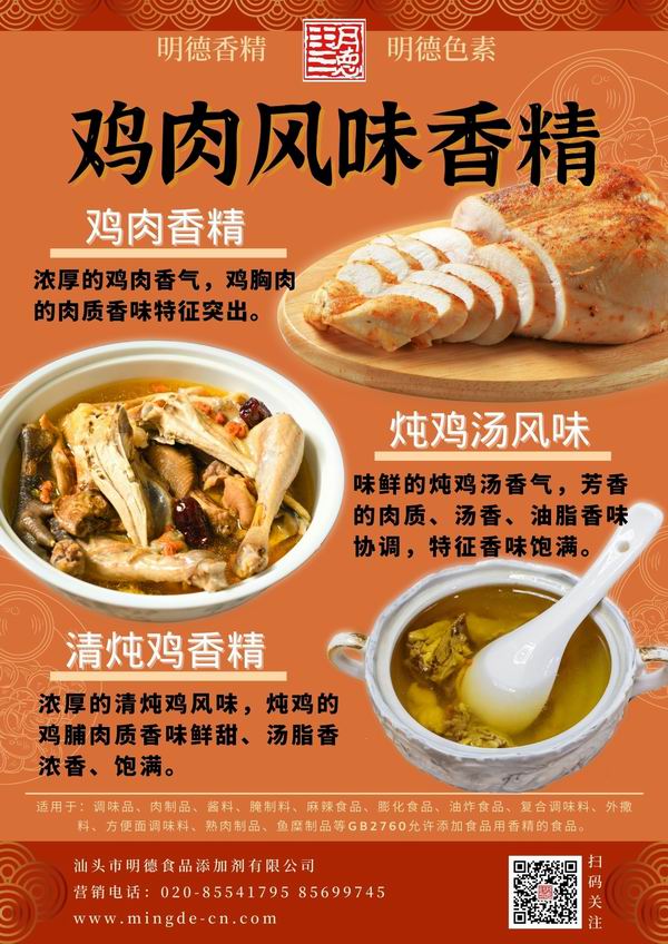 在雞肉香精領(lǐng)域我們潛心專研,結(jié)合市場(chǎng)潮流,消費(fèi)者喜好,汕頭市明德食品添加劑有限公司現(xiàn)有以下16種雞肉相關(guān)風(fēng)味的香精,供您選擇。并持續(xù)努力研發(fā)更多符合市場(chǎng)需求的風(fēng)味。