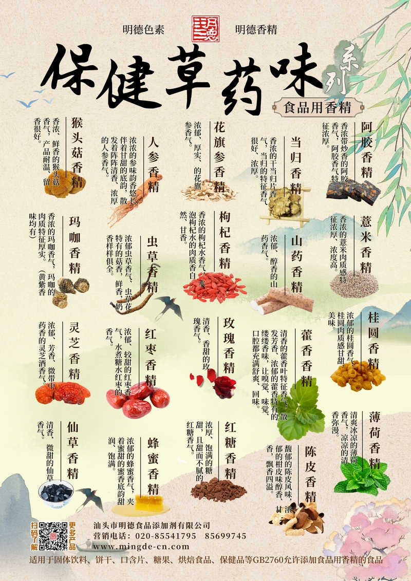 明德香精天然草藥風(fēng)味香精系列 天然植香 層次鮮明汕頭市明德食品添加劑有限公司專為B端客戶研發(fā)天然草藥風(fēng)味香精系列。產(chǎn)品模擬多種草藥與植物的天然香氣,清新自然,風(fēng)味逼真。適用于飲料、糖果、零食、保健品及復(fù)合調(diào)味品的生產(chǎn),是您打造優(yōu)質(zhì)草本風(fēng)味食品的可靠之選。